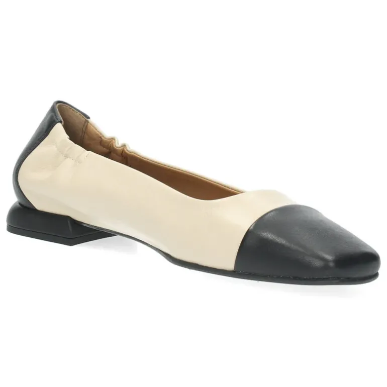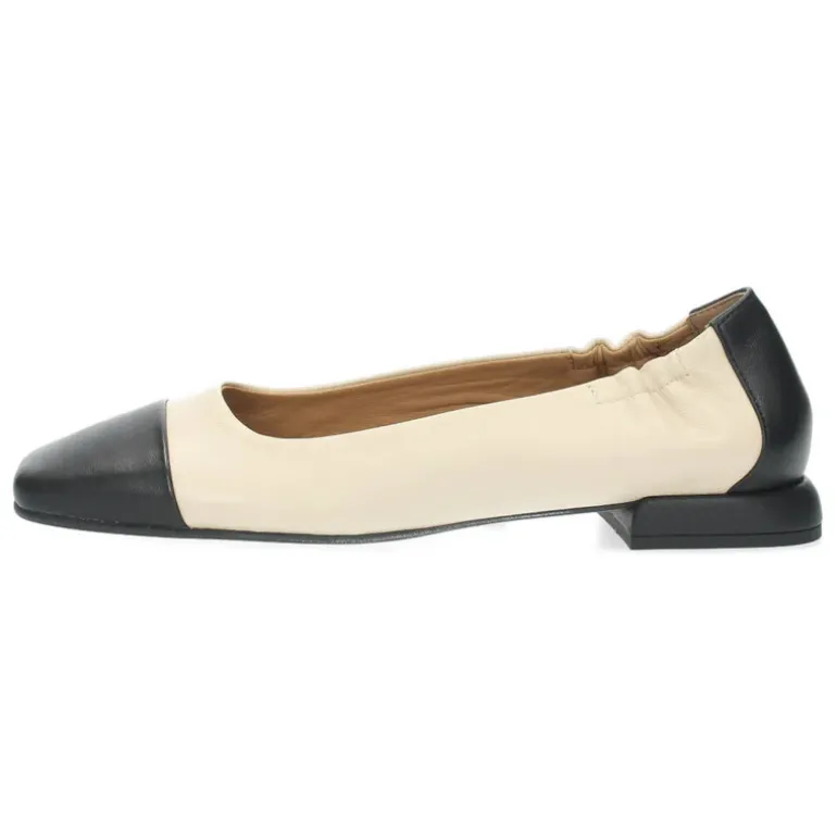 Beige ballerina’s met een zwarte vierkane top.Het model dat we tonen op de foto is maat 37.