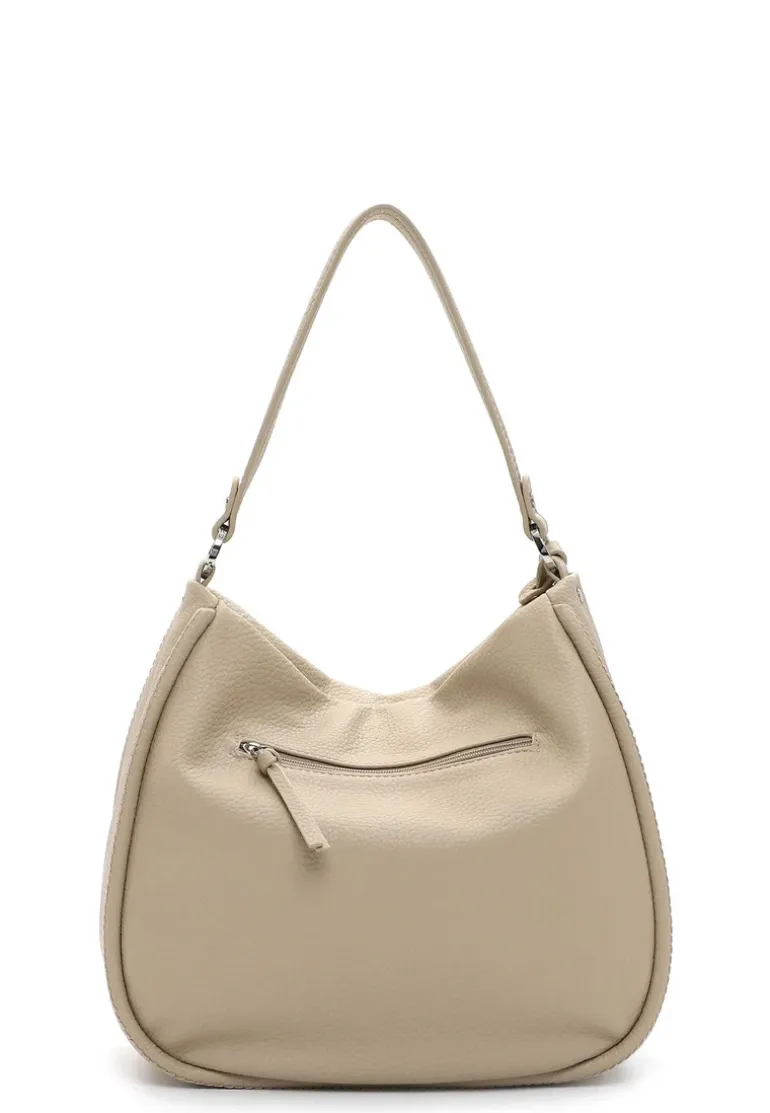 Deze beige handtas heeft een hoogte van 32 cm, een breedte van 33 cm en een diepte van 13 cm.