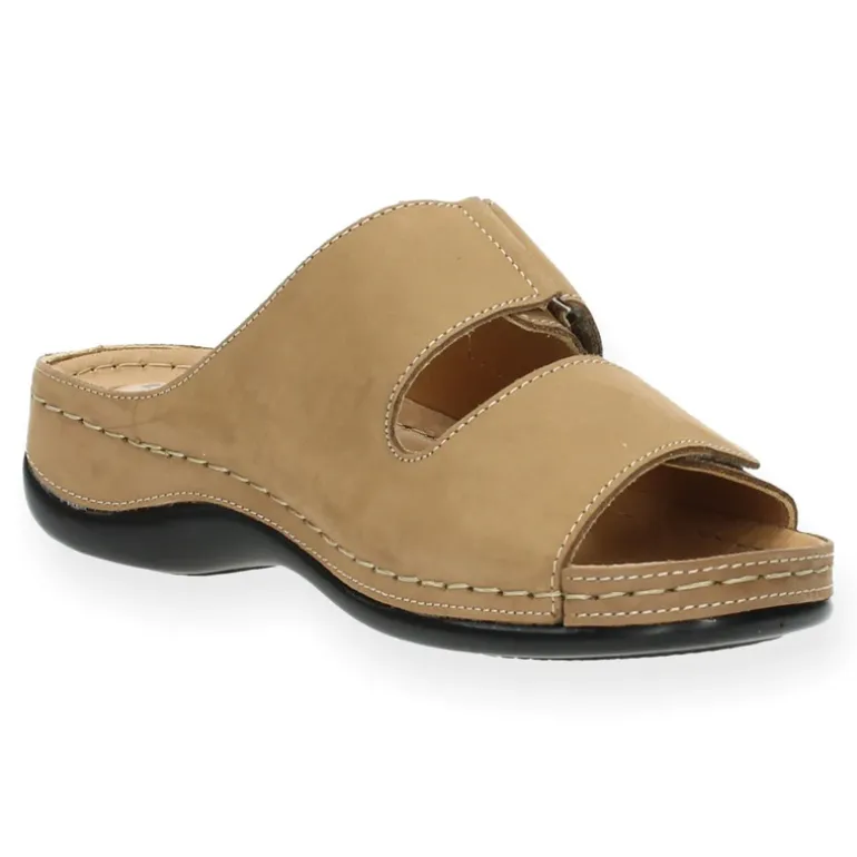 Beige slippers met velcro’s en een lederen binnenzool.Het model dat we tonen op de foto is maat 37.