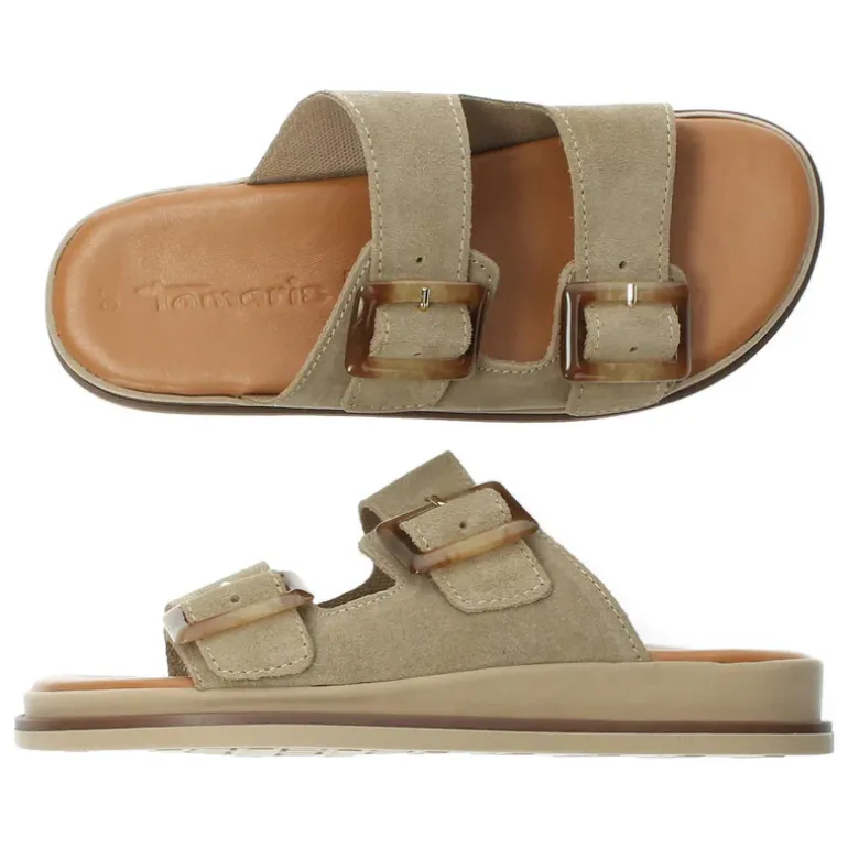Beige slippers met een lederen zool .Het model dat we tonen op de foto is maat 37.