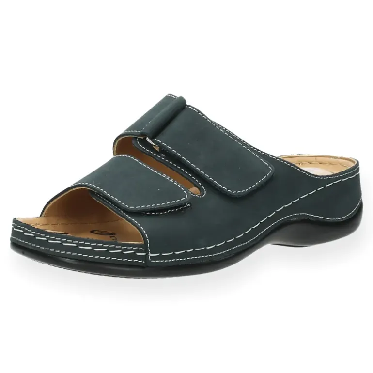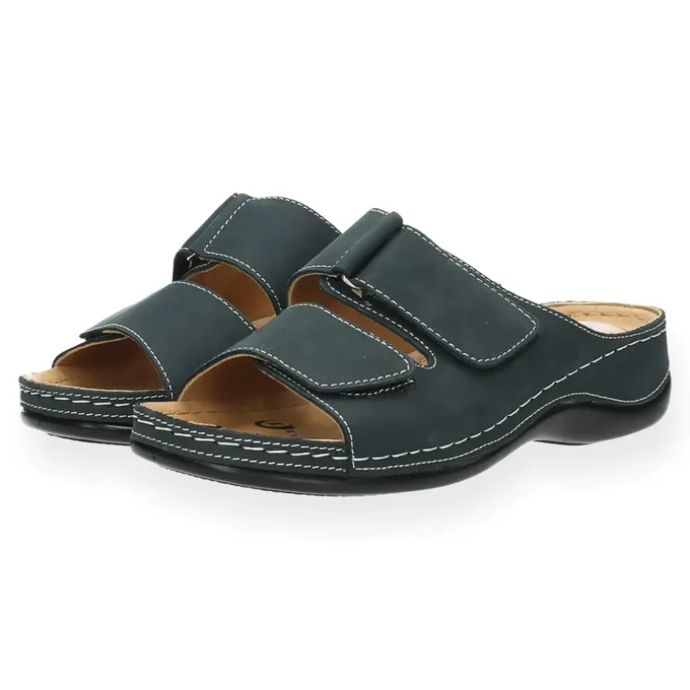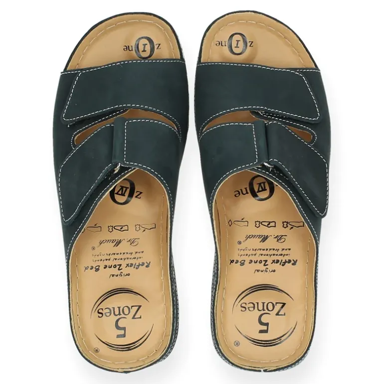 Blauwe slippers met velcro’s en een lederen binnenzool.Het model dat we tonen op de foto is maat 37.