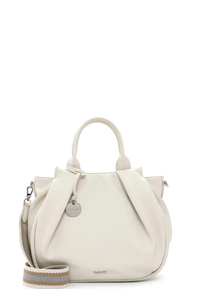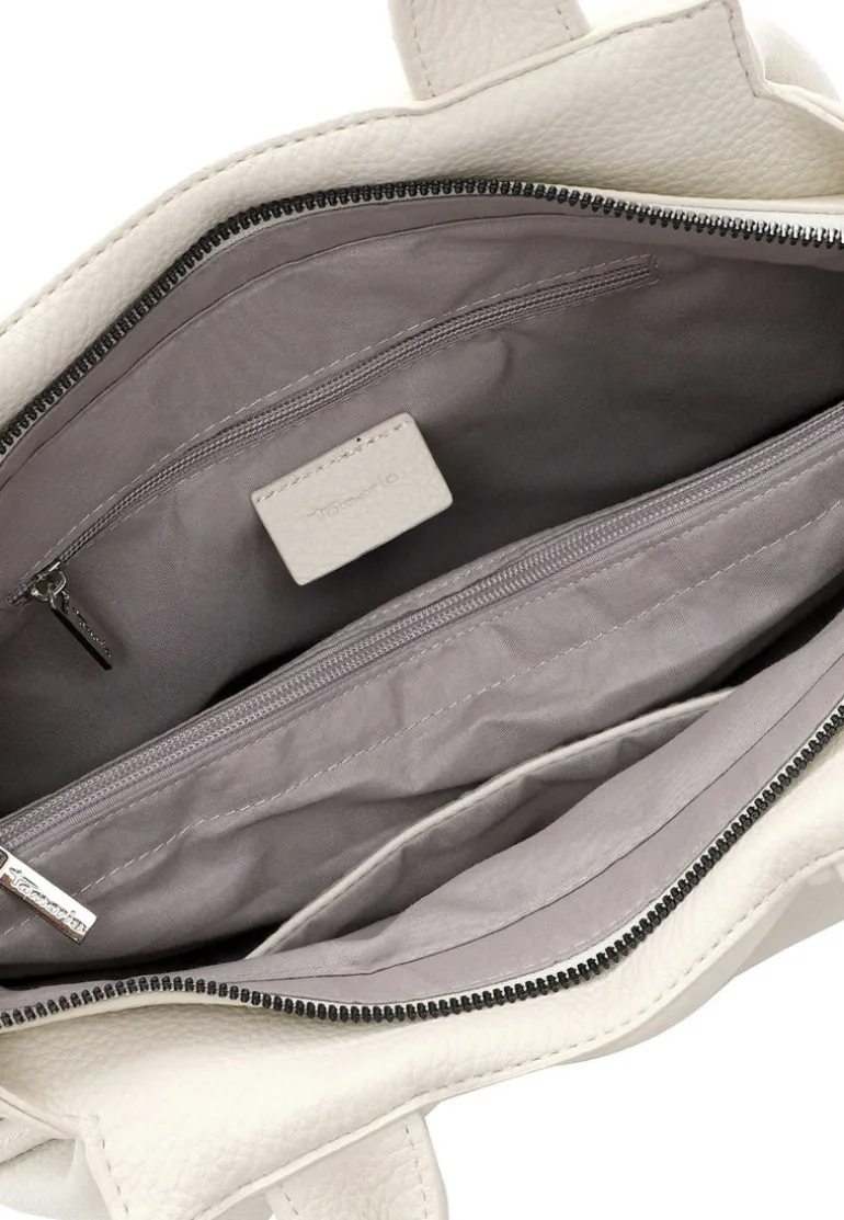 Deze ecru handtas heeft een hoogte van 28 cm, een breedte van 33 cm en een diepte van 12 cm.