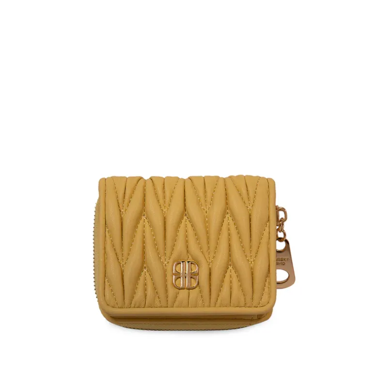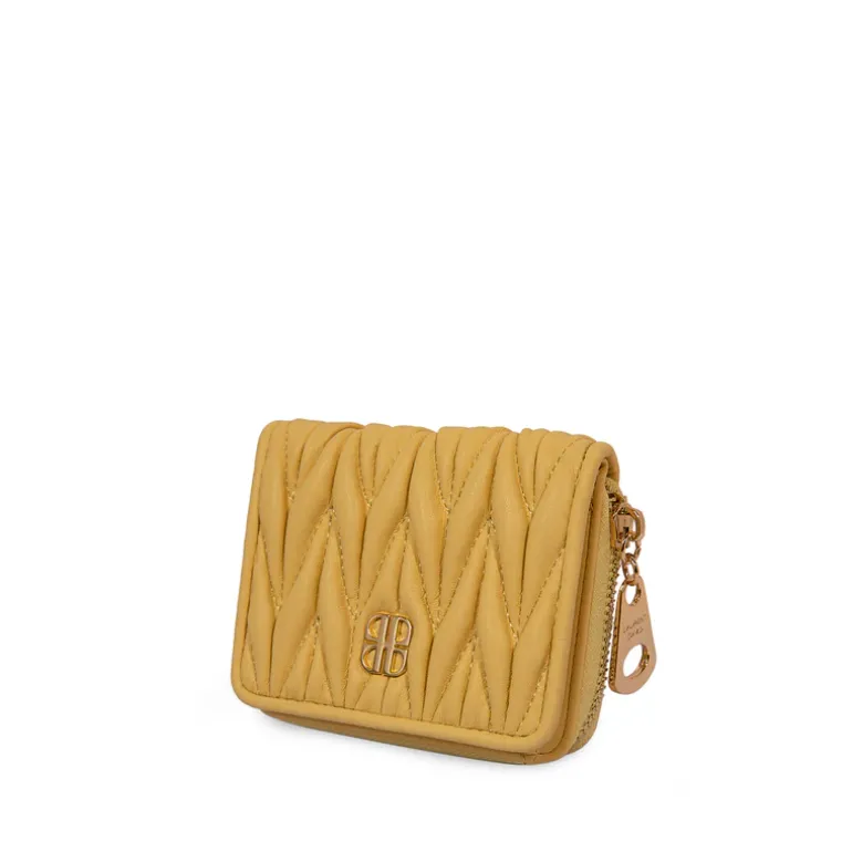 Deze gele portefeuille heeft een hoogte van 9 cm, een breedte van 14 cm en een diepte van 3 cm.