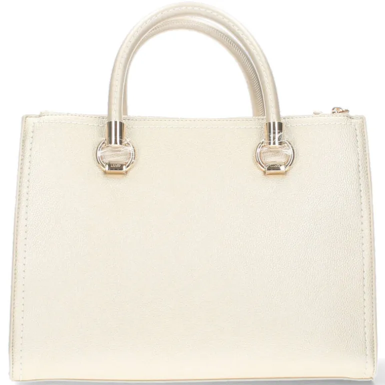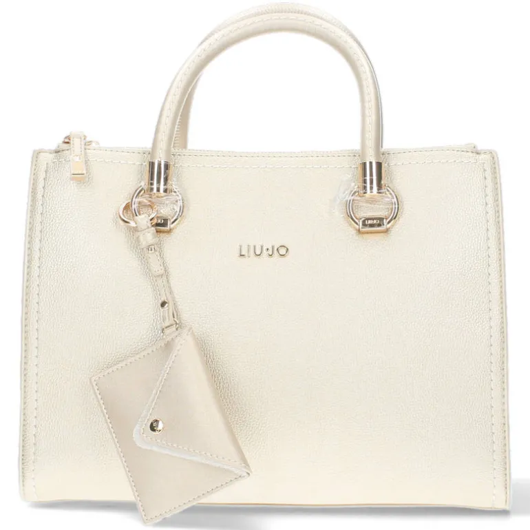 Deze gouden handtas heeft een hoogte van 26 cm, een breedte van 33 cm en een diepte van 13 cm.
