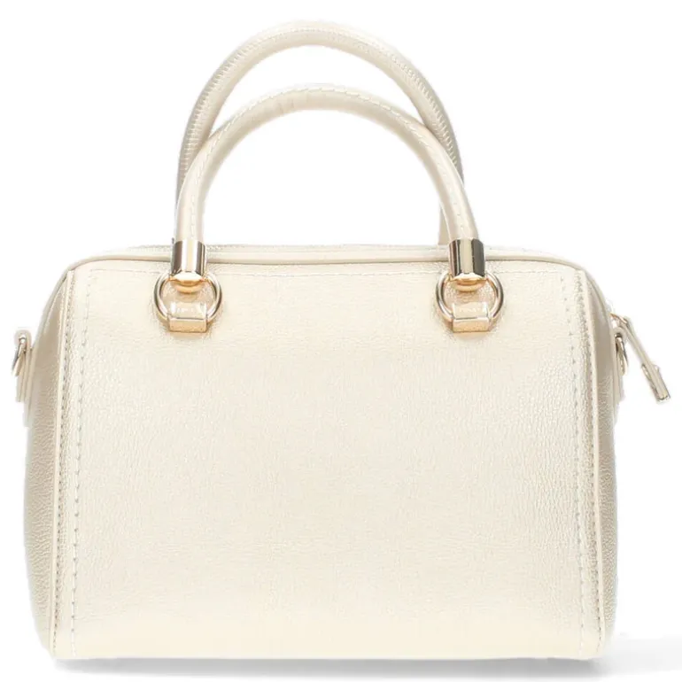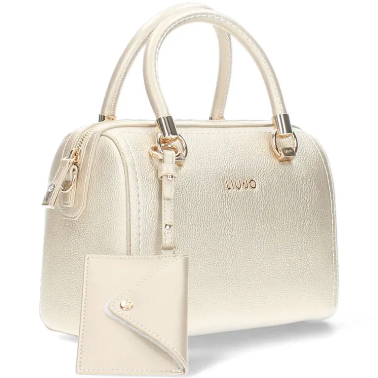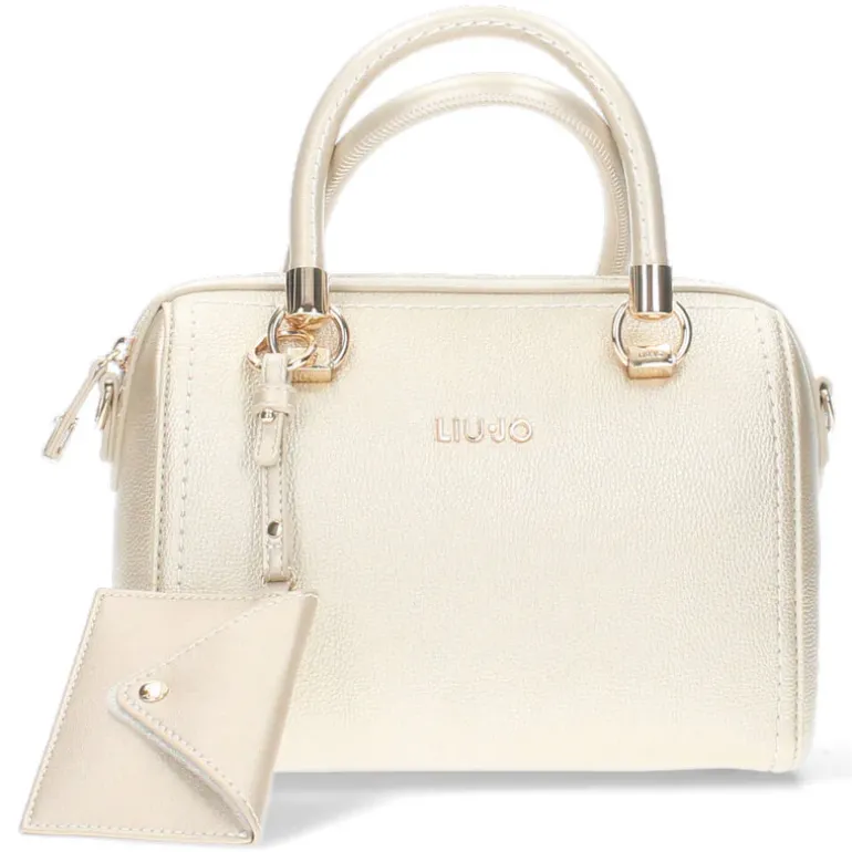 Deze gouden handtas heeft een hoogte van 18 cm, een breedte van 24 cm en een diepte van 13 cm.