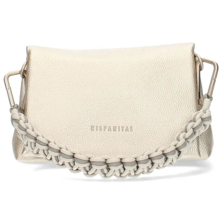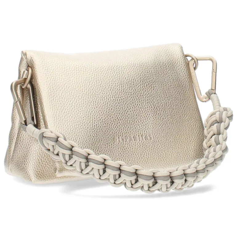 Deze gouden handtas heeft een hoogte van 14 cm, een breedte van 23 cm en een diepte van 7 cm.