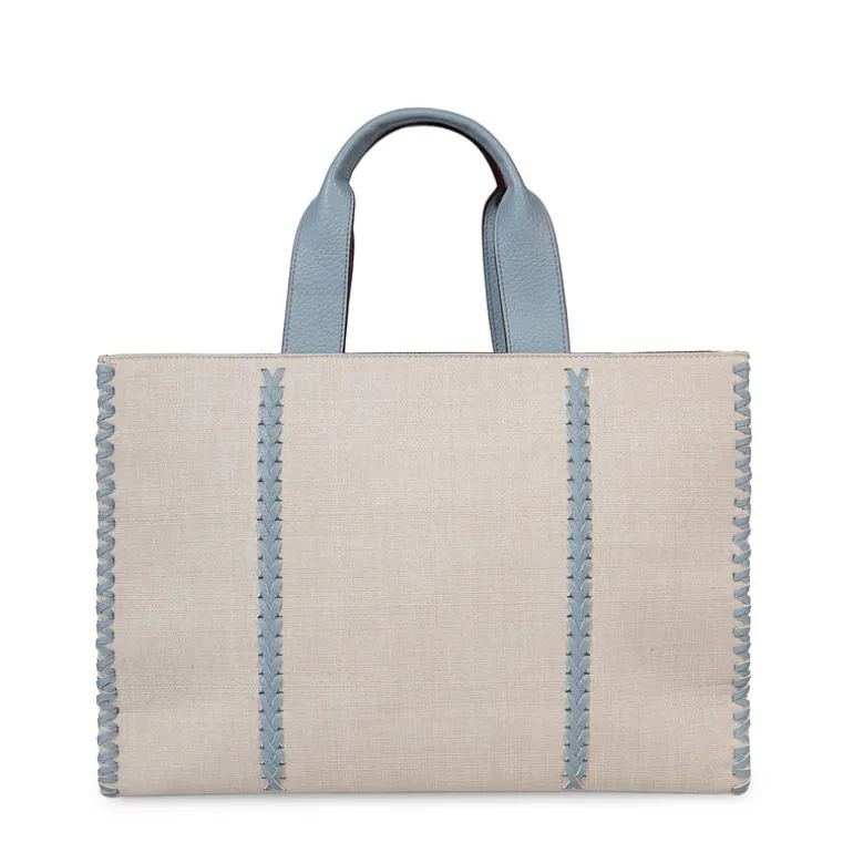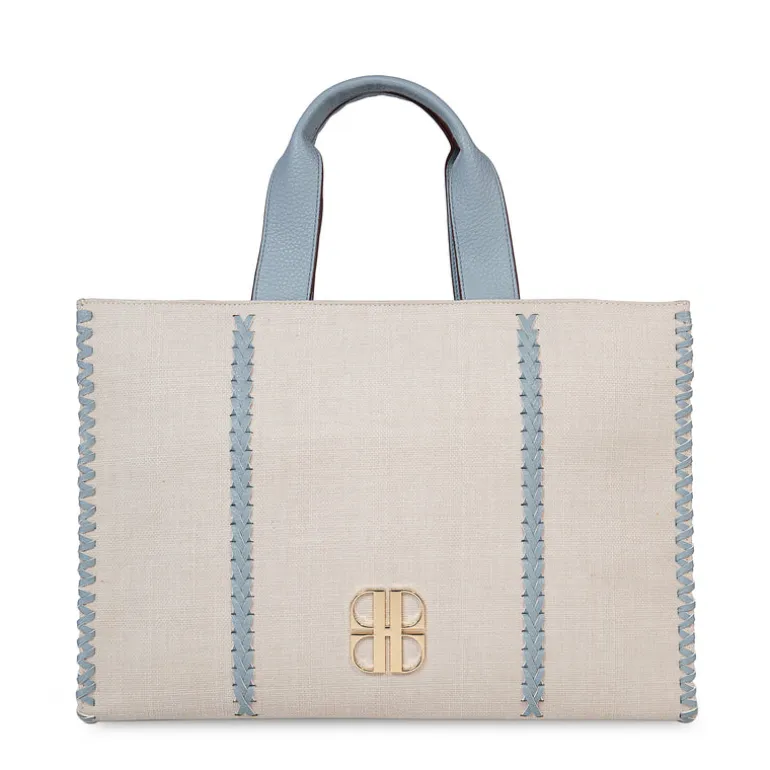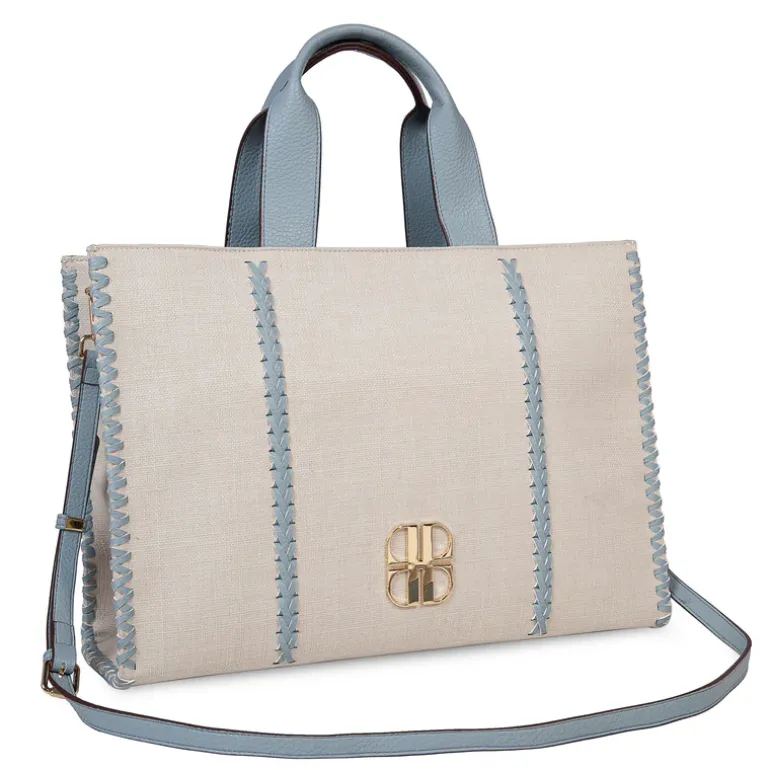Deze lichtblauwe handtas heeft een hoogte van 40 cm, een breedte van 30 cm en een diepte van 12 cm.