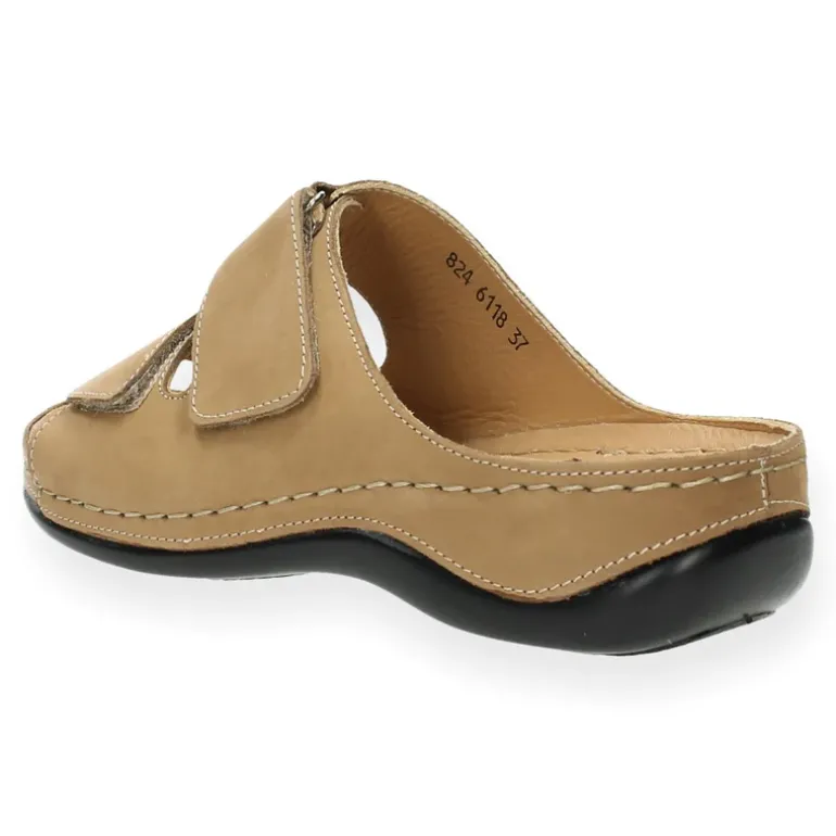 Beige slippers met velcro’s en een lederen binnenzool.Het model dat we tonen op de foto is maat 37.