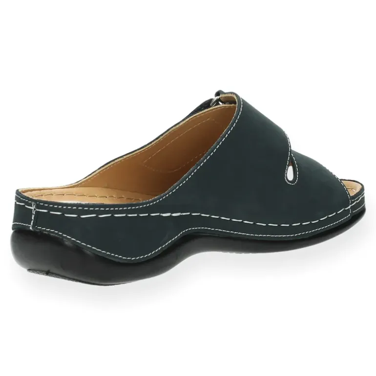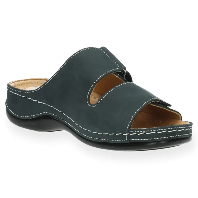 Blauwe slippers met velcro’s en een lederen binnenzool.Het model dat we tonen op de foto is maat 37.