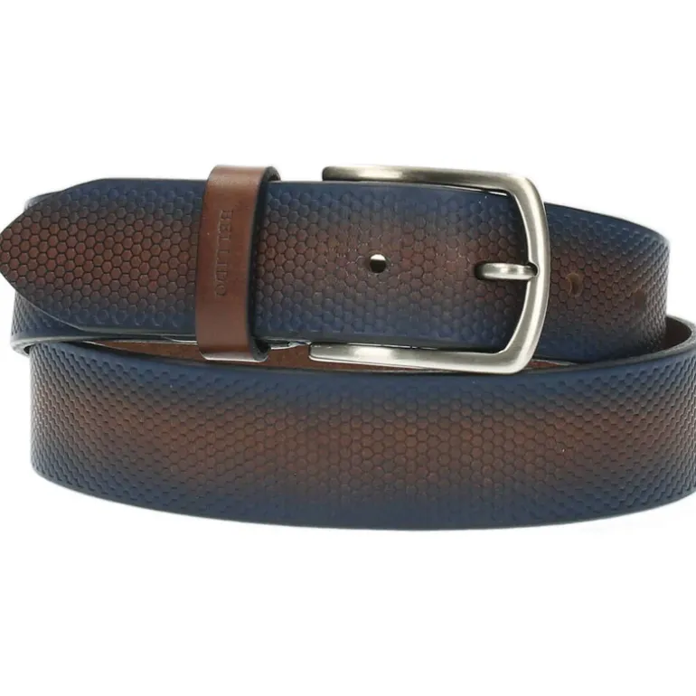 Bruine riem met blauwe rand.Het model dat we tonen op de foto is maat 95.