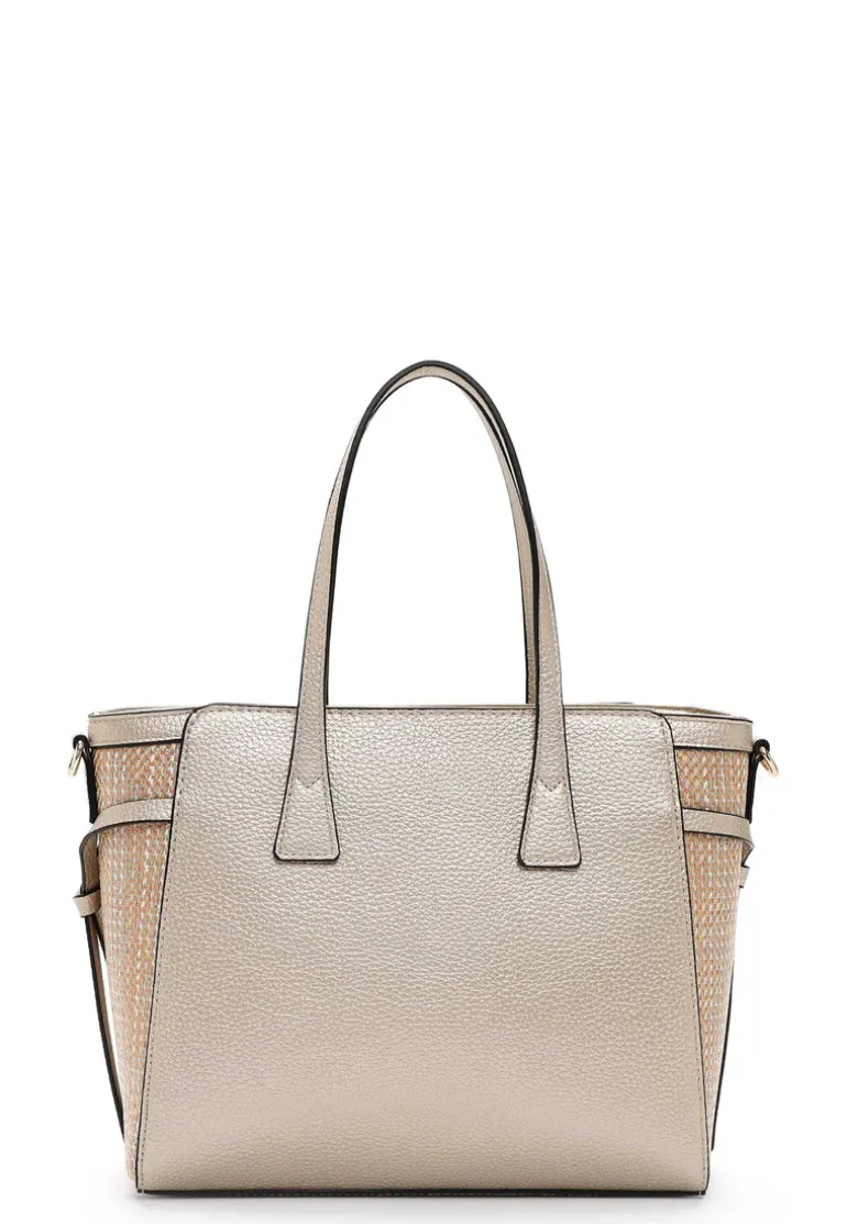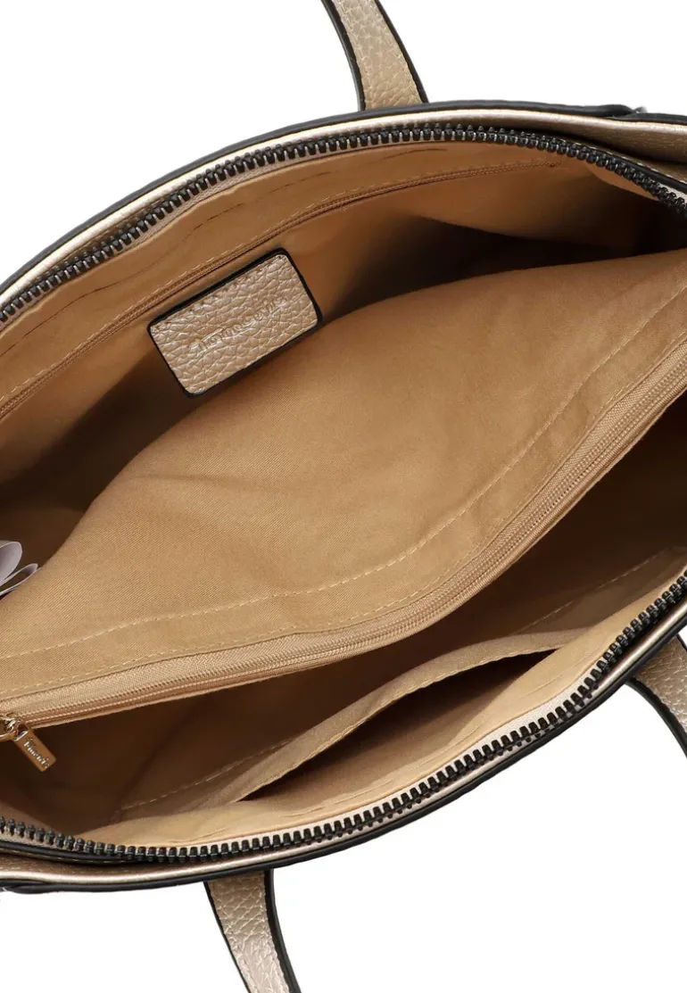 Deze gouden handtas heeft een hoogte van 23 cm, een breedte van 33 cm en een diepte van 11 cm.