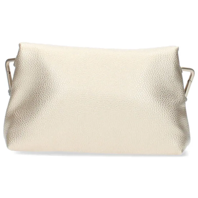 Deze gouden handtas heeft een hoogte van 14 cm, een breedte van 23 cm en een diepte van 7 cm.